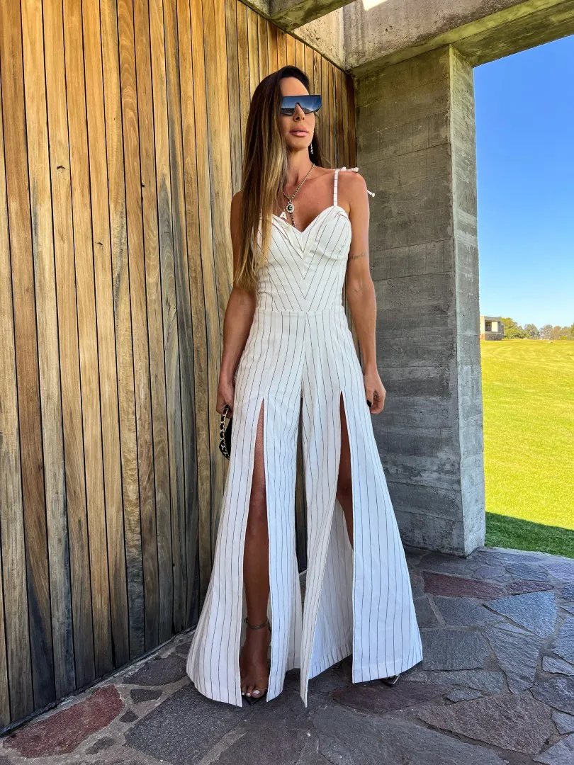 Macacão Risca de Giz Sereno – Sofisticação e Estilo com Fendas Poderosas!